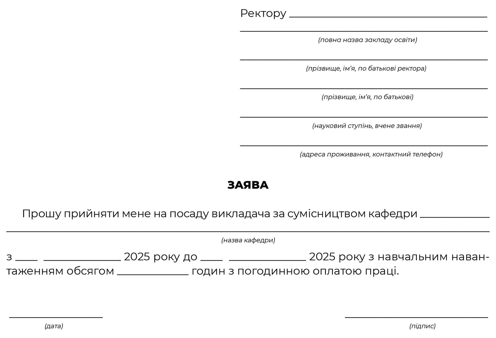 Зразок заяви особи для роботи на умовах погодинної оплати